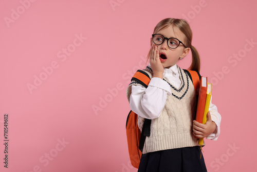 Emotional schoolgirl in glasses with backpack and books on pink background, space for text