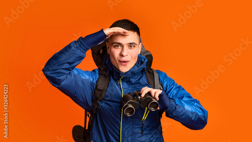 Emotional traveler making sightseeing, using modern binoculars