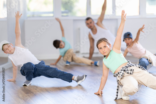 Emotional tween girl dancer rehearsing modern krump dance moves during group workout in kids studio under guidance of male instructor