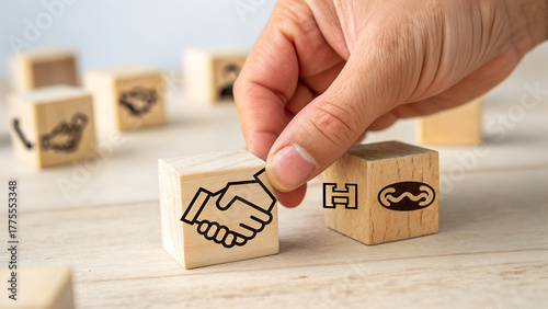 Empathy in leadership concept. Wooden block symbolizing empathy and partnership among blocks representing individuals, emotional intelligence and trust in workplace leadership and team .