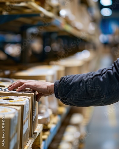 Employee arranging boxes on warehouse shelf