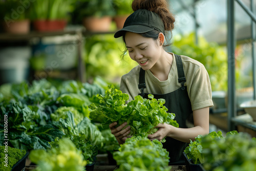Empowered Female Farmer Inspects Homegrown Lettuce for Sale and Consumption