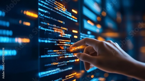Empowered Woman in Tech, showcasing coding skills and holographic interfaces, emphasizing cybersecurity, investment analysis, and the future of digital trading environments.