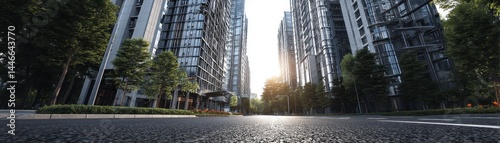 Empty asphalt road in front of sleek building, bright daylight - background pattern seamless design