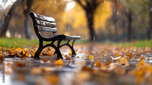 Empty bench on a quiet park pathway surrounded by fallen leaves under an overcast sky