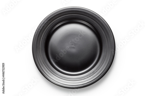 Empty black plate isolated on white background. Top view.