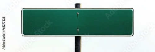 Empty blank green road sign on a sturdy metal pole isolated on white background