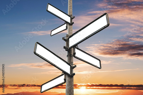 Empty blank road signpost, with sunset sky background
