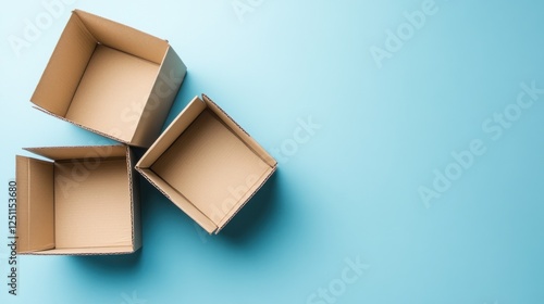 Empty cardboard boxes on blue background; packaging, delivery concept