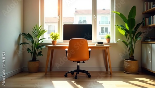 Empty chair at desk facing computer, sunlit room, computer, office
