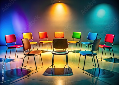 Empty chairs, circle composition, AI art. Modern aesthetic.