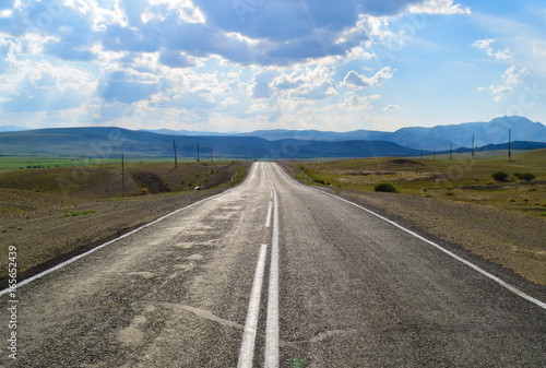 Empty "Chuyski Trakt" high road in Chuyski prairie in Altai mountains. Altay Republic, Siberia, Russia.