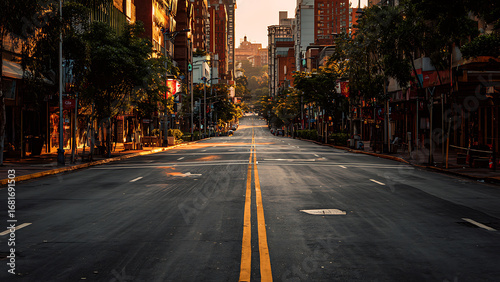 Empty City Street at Golden Hour with Tall Buildings and Trees, Urban Landscape