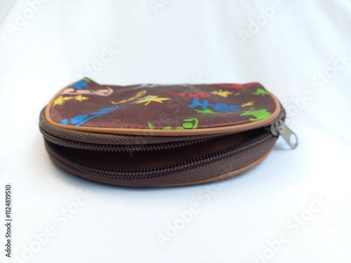 Empty coin purse with open zipper isolated on white background. Close up. Copy space. Selective focus.