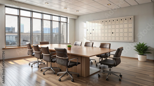 Empty conference room with a table, chairs, and a schedule on the wall, awaiting a parent-teacher meeting or conference, with natural light and minimal decor.