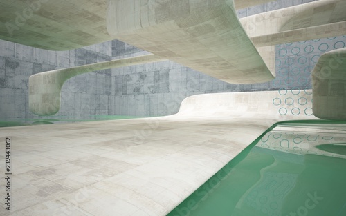 Empty dark abstract concrete smooth interior with blue water . Architectural background. 3D illustration and rendering