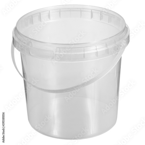 Empty food packaging bucket transparent plastic closed lid isolated on white background