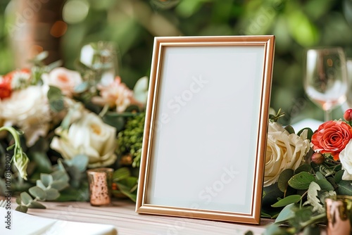 Empty frame on wedding table with floral arrangement