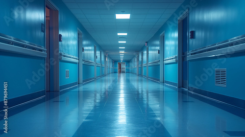 Empty Hospital Hallway with Blue Walls and Shiny Floor Under Bright Lights