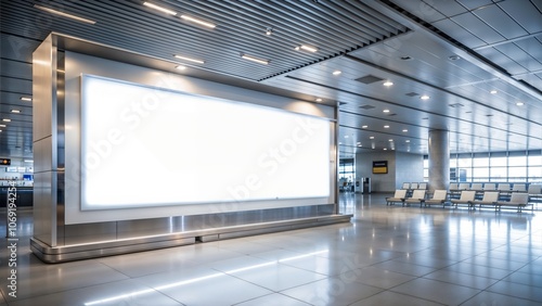 Empty illuminated billboard in modern airport lounge with seating area and bright interior
