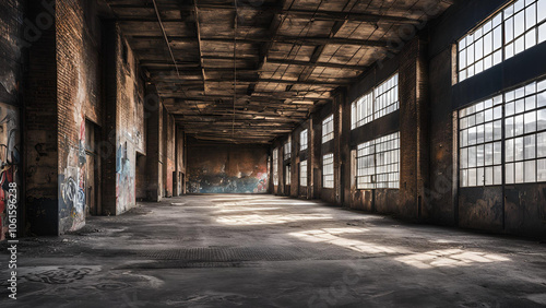 Empty Industrial Space: A haunting glimpse into a derelict warehouse, bathed in the ethereal glow of sunlight streaming through high windows. The weathered walls, graffiti-laden.