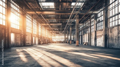 Empty industrial warehouse bathed in sunlight.