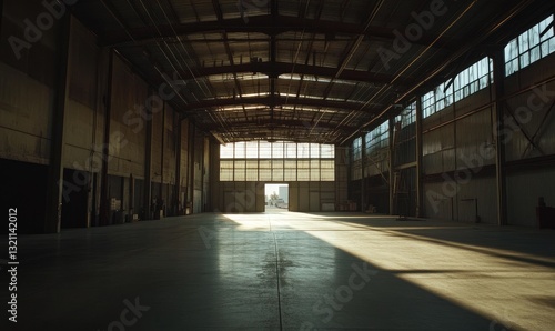 Empty industrial warehouse interior. Sunlight streams through large doors