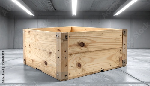 Empty Light Brown Wooden Crate in Gray Industrial Setting