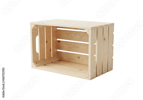Empty light wood crate, perfect for storage or display, angled view showcasing its simple design and natural beauty.