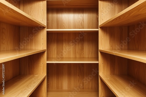 Empty light wooden shelves extend into the distance, creating a symmetrical perspective