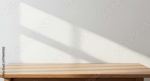 Empty light wooden table with sunlit white wall and shadows in a minimalist room, perfect for product display or background.