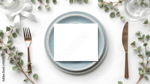 Empty menu and plates on light blue background, top view. Mockup for design.