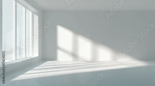 Empty minimalist room with sunlight streaming through large windows, casting shadows on white walls and floor