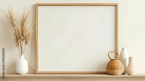 Empty mock up blank poster frame on wooden shelf, Generative AI illustrations.