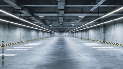 Empty modern concrete underground parking garage with bright LED lighting and marked parking spaces.