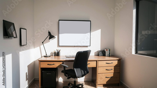 Empty modern conference room interior with large table, white chairs, flat screen on wall, and daylight city view through glass windows. 3D Rendering.