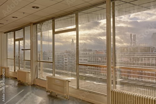 Empty office room with big windows looking out on the city of Ghent