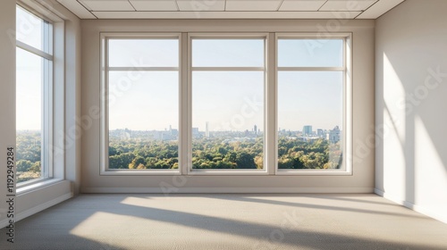 Empty office room with floor-to-ceiling windows maximizing natural light
