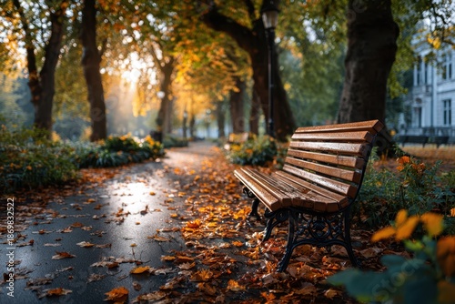 Empty Park Bench on Rainy Autumn Day