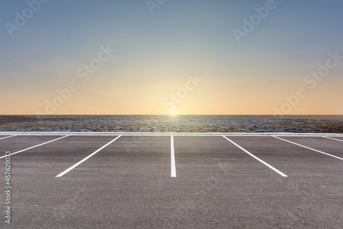 Empty parking lot against arid area and beautiful sunset sky.