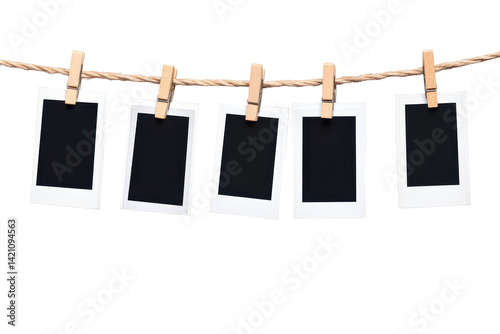 Empty polaroid photos hanging on clothesline isolated on white background with vintage nostalgic vibe