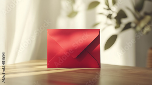 empty red envelope in matte red color placed on wooden table, with slight shadow cast by soft natural lighting through window in background, Ai generated images