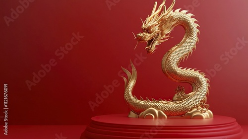 empty red podium display with Gold dragon sculpture, luxury Asia Chinese ornament style.