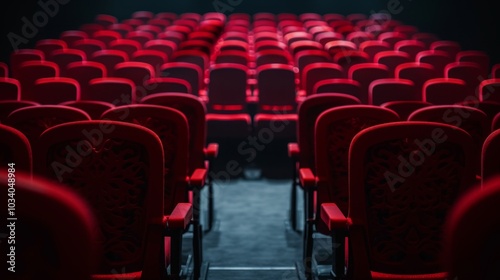 Empty red theater seats in a dimly lit auditorium. Rows of seats await the audience.