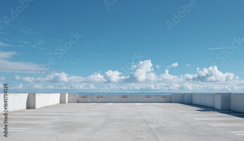 Empty rooftop terrace with a smooth concrete , overlooking a city skyline under a bright blue sky with scattered clouds