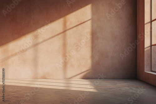 Empty room with monochrome brown textured wall with shadows. Wall scene mockup for showcase with copy space.