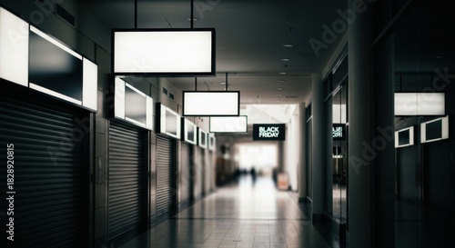 Empty shopping mall hallway with closed stores and Black Friday advertisement