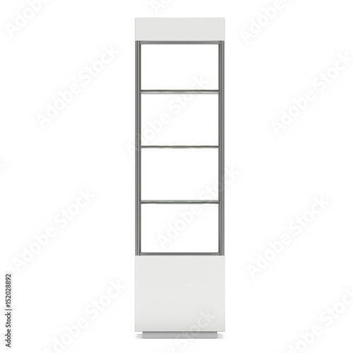 Empty showcase with glass shelves for exhibit. 3D render illustration isolated on white background. Trade show booth blank pedestal for expo design.