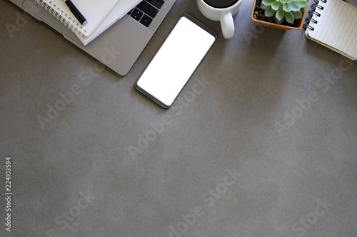 Empty smartphone on workspace with office supplies and copy space for top view.