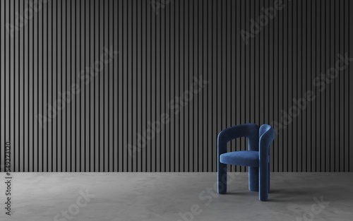 Empty space, room with dark blue chair on the concrete floor, decorative black wall with embossed panels, interior background and 3d render